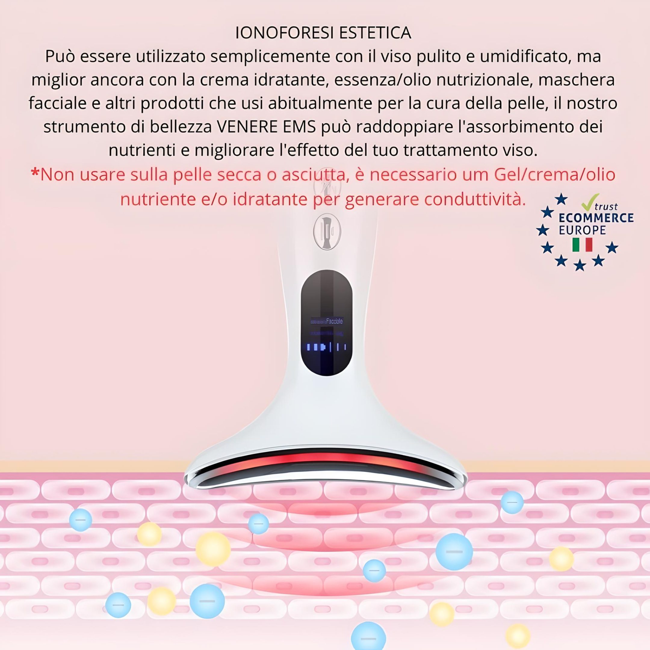 ● Gli ioni positivi e negativi vengono introdotti in modo efficiente per migliorare l’assorbimento dei nutrienti da parte della pelle. Se utilizzato con oli/crema e/o maschera, l’effetto è raddoppiato. Applicare una pressione media con il dispositivo sulla zona trattata.