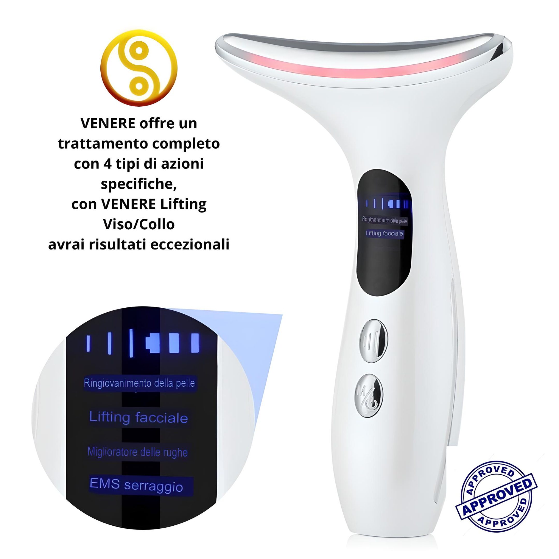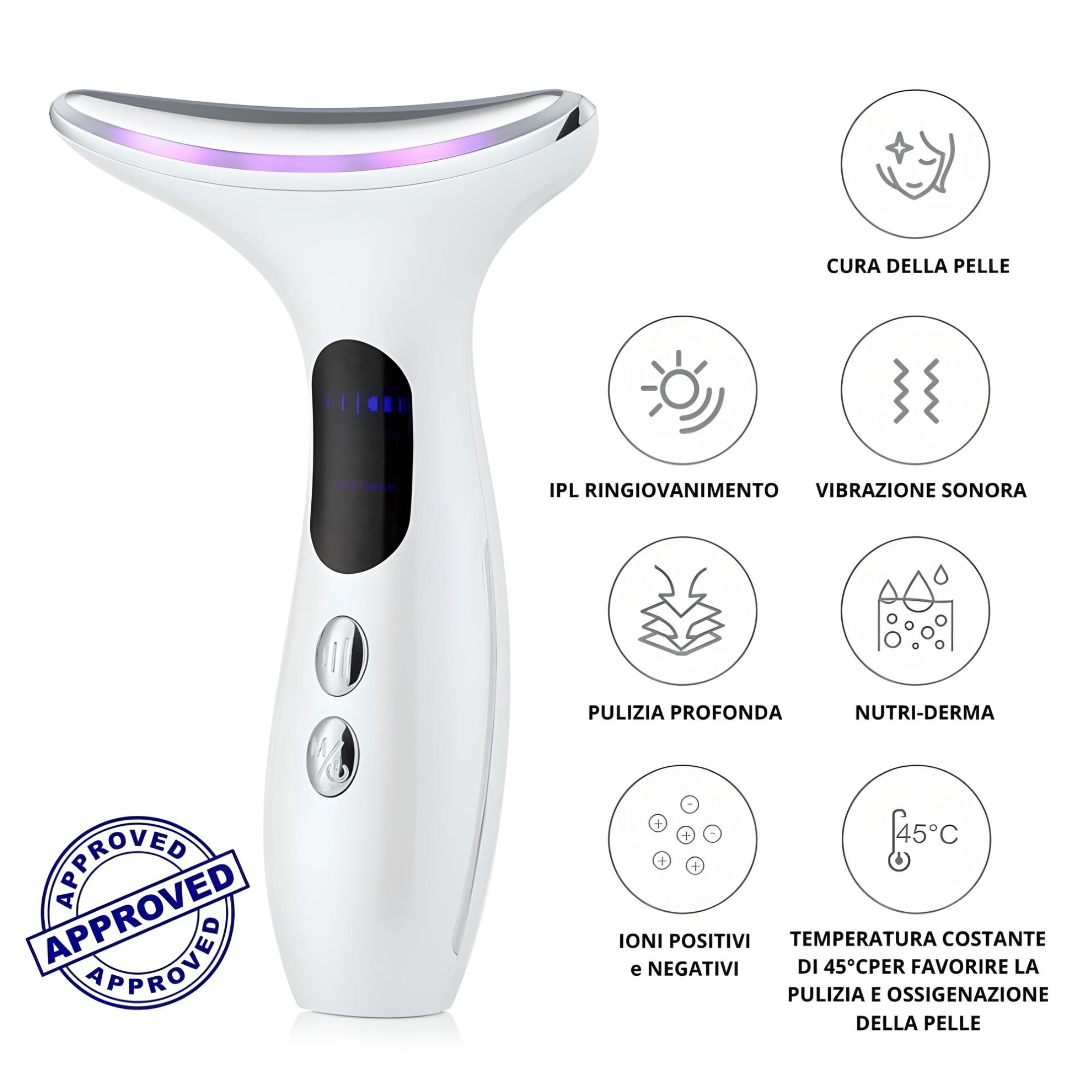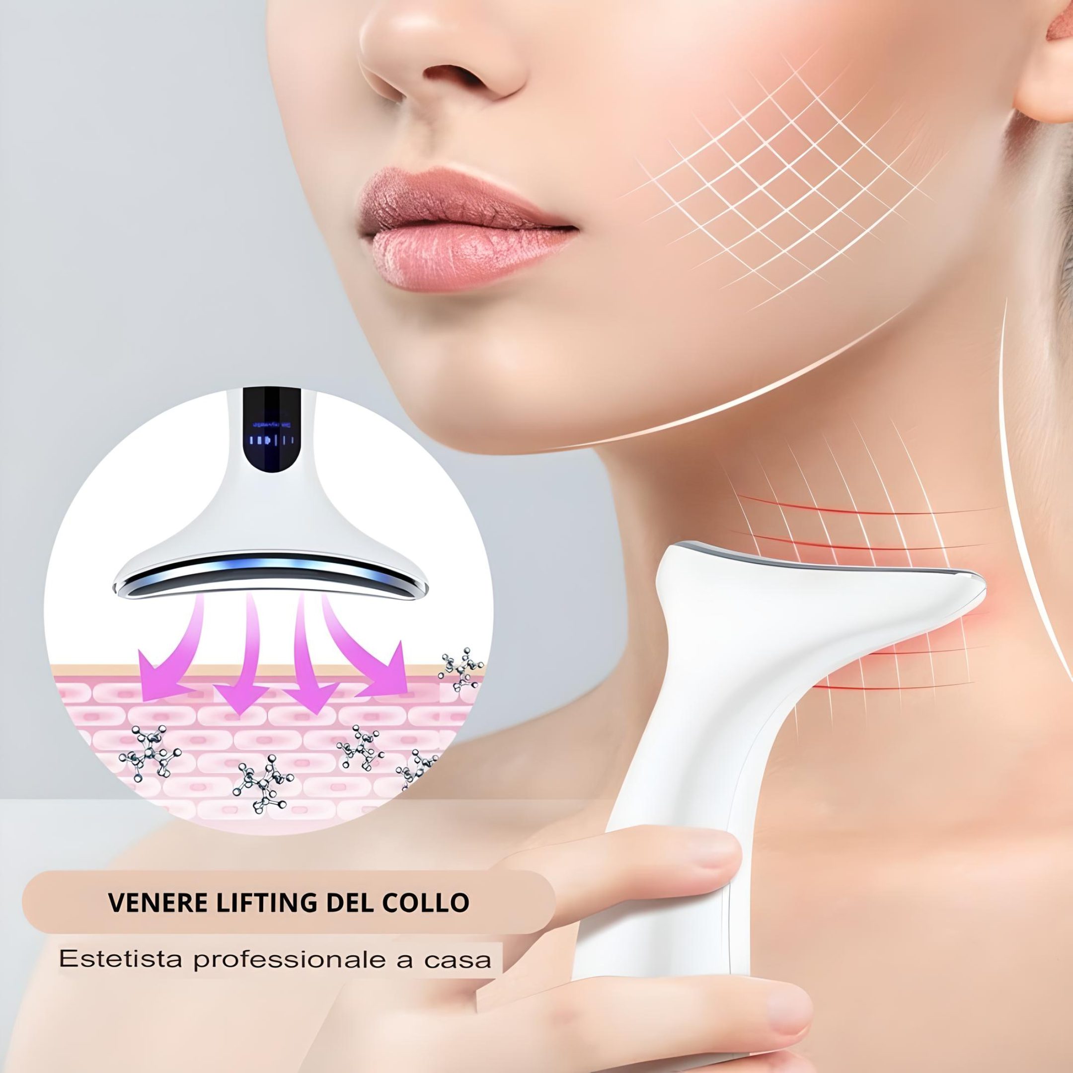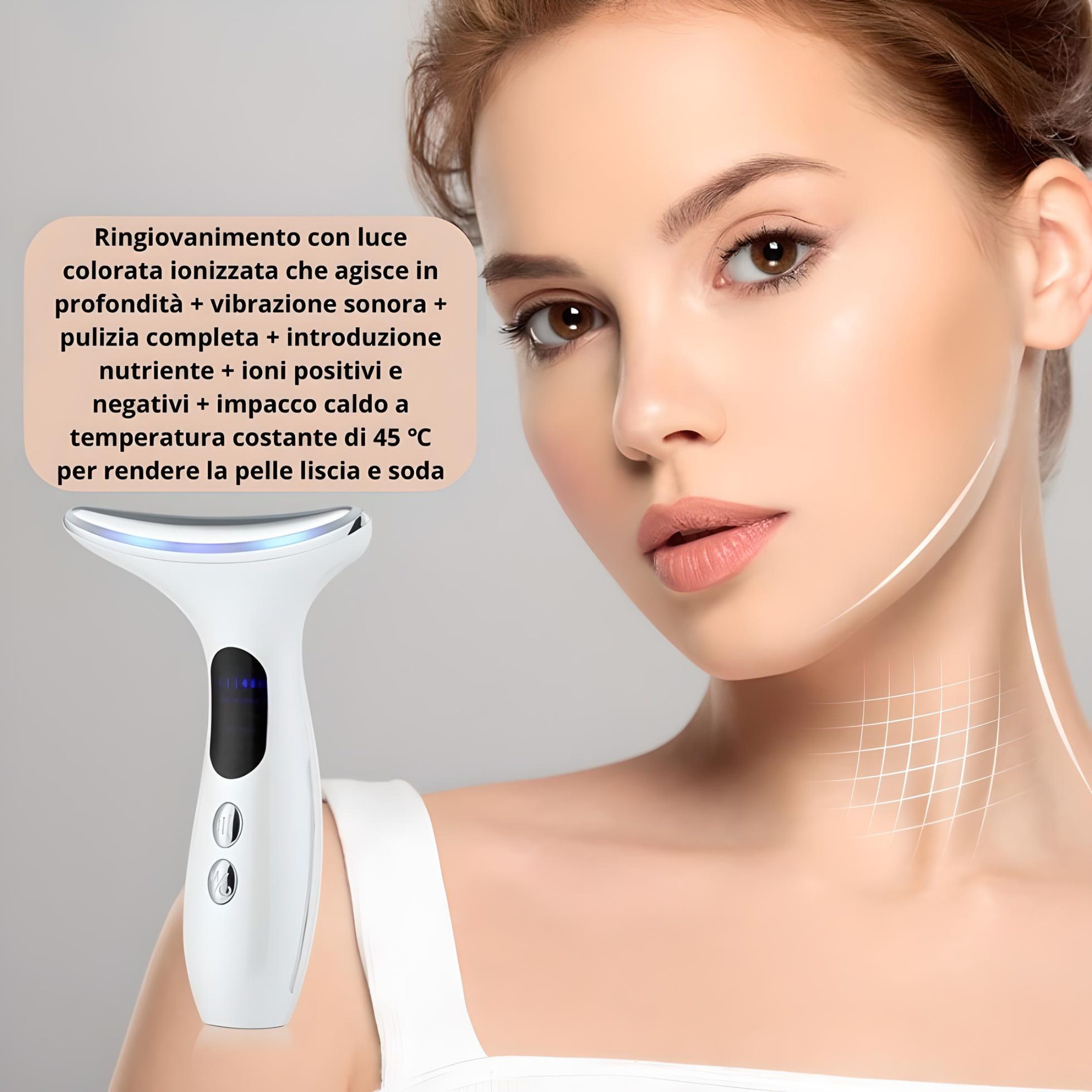● Dispositivo per la bellezza e la tonificazione del derma, utilizzato sia sul collo che sul viso per sollevare e rassodare efficacemente la pelle, riducendo le rughe del viso e le linee del collo.